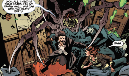 A further creature now comes through the door, a large demonic spider. It’s willing to compromise, it roars: it only wants their heads! Angel and Faith can keep the other parts!