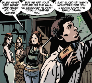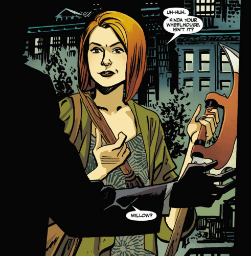 As he opens the door, his last word escapes him. “Uh huh,” his visitor says. It’s Willow Rosenberg. She has the damaged Slayer Scythe in her hand. “Kinda your wheelhouse, isn’t it?” she retorts.