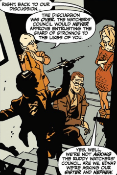 Edna interrupts. “What my son is trying to say is that you have never in your lives performed a single responsible act with your gifts. Nor will you reveal what you want with the shard – one of the more deadly objects in the Watcher’s Armoury which can convert matter into energy.” She finishes by explaining that while the Watchers may not have the raw power to deal with the shard, they can certainly keep it away from the flighty reaches of her siblings.