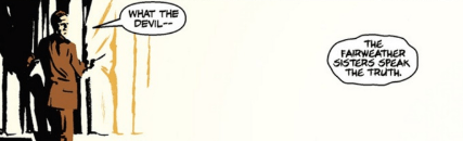 Suddenly, from outside, a blind dazzling light catches their attention and a deep voice comes from the glare. “The Fairweather sisters speak the truth.”