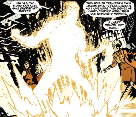 The creature materialises inside the residence, a being of light, shaped vaguely humanoid. Edna gasps in surprise. “A light demon!” The demon laughs. “The shard can make energy into matter. The sisters hope to transform their lovers back into flesh, seeing as I have made them beings of light, trapped within their vain paramours’ mirrors.”