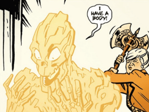 The creature rises to his full height and beams in joy. “It worked, I have form. I exist in the physical realm.” He can scarcely believe it. He doesn’t have time to enjoy it, as Edna, now wielding an antique axe, takes the demon’s head off, while Mr. Giles covers his son’s eyes.