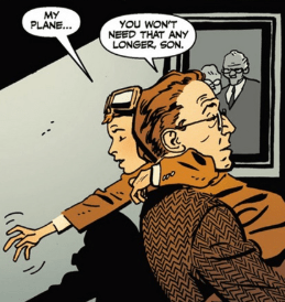 His father arrives in the room and scoops Rupert up into his arms. “Come along now, Rupert. Your spitfire will have more room for manoeuvres upstairs.” Rupert tells his dad that it’s not a Spitfire, but a Mosquito and his father beams in delight at his son’s knowledge. Behind Mr. Giles is his mother, Edna Fairweather. She looks glum, presumably as she knows her sisters are waiting for her to resume their discussion.