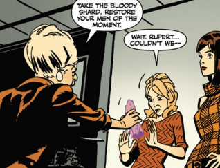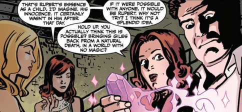 “That’s Rupert’s essence as a child, I’d imagine,” Lavinia tells them as they look at the glow coming off the shard and connecting with the Tooth of Ammut on Angel’s chest. Faith looks at the shard and then the women: “Hold up. You actually think this is possible? Bringing Giles back from a natural death in a world with no magic?” Sophie suggests that if it’s possible with anyone, then Rupert is a prime candidate due to his latent magical prowess. “I think it’s a splendid idea,” Lavinia concludes.
