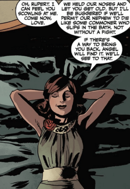 As Angel and Faith reconvene in the hallway, neither mentions what each sister has told them. In her room, Lavinia looks up at the ceiling and smiles. “Oh, Rupert,” she whispers. “We held our noses and let you get old. But I’ll be buggered if we’ll permit our nephew to die like some commoner who slips in the bath. Not without a fight. If there’s a way to bring you back, Angel will find it. We’ll see to that.”