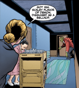 As she leaves, Kennedy comes over the ear piece. “We’ve got suspicious activity on your floor.” Buffy is surprised. “Already? I haven’t even raided the mini bar yet,” she jokes. She sticks her head outside of the room, and sees a demon, “disguised as a bellhop.”