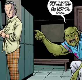 As Theo gets into their private car, he explains: “An organisation from a Hell dimension is trying to kill me. I think you’ve heard of them before,” he says. He looks them both in the eyes, fear coming off him in waves. “They’re called Wolfram & Hart.”
