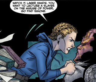 Koh accuses her of profiting from the world’s magic loss, which gets Buffy riled up, She grabs a hold of Koh by his collar. “Watch it, laser hands!” she rages in anger. “You want to lecture a Slayer on the misuse of power, go find Simone. Me? I’m trying to get my life together.” She gets up and backs away from him, her voice slightly anguished. “Just like you,” she says. Now can someone convince me of what I just said, is the thought that comes to her mind next.