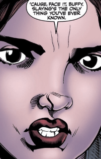Buffy asks why her, especially while she’s in the middle of a vacation, specifically away from actual slaying? Koh says it’s because she’s the Slayer, but Buffy doesn’t think Kennedy will thank her for running around with Koh – at the moment, this job means she can actually build a life that revolves around things other than demons.