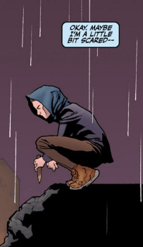 Back in San Francisco, Buffy is atop a high-rise, perched on a gargoyle, in the rain. Okay, maybe I’m a little scared, she admits to herself. But so are other people and no matter what Kennedy says, I can’t walk away from them. She spots a familiar sight after hearing a familiar sound: a victim, chased into an alley way by a vampire. As she moves quickly towards the danger, she’s not that worried about Kennedy firing her. At least she got here in time to make a difference.