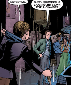 “Buffy Summers is chasing me down for a change?” he chuckles at her. She mentions the cop taking her gig from her, to which Dowling tells her that thanks to her and Spike’s training, the cops of San Francisco may start to give her a run for her money.