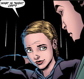 Buffy looks at him quietly for a moment and places her hand on his arm. She offers her condolences on Miranda Cheung’s death. Dowling thanks her, but it’s her senseless death that has enabled the department to create the new anti-vampire task force. Buffy is surprised that the cops are being trained in Slayer techniques and Dowling tells her that while it hasn’t been easy, it’s getting easier. Buffy smiles and jokes. “So you don’t need me to keep the streets zomp-free?” she asks. Dowling says he’d not sure that they can do it all without her, but she can certainly have a night off every now and then. Buffy looks at him, confusion on her face. “What’s a night off?” she asks with a mischievous smile.