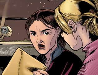 Walking through Kennedy’s base, Buffy is surprised how many Slayers are present. “There’s not a lot ex-Slayers are suited for in a world that’s minus the magic. Most of us didn’t even finish high school,” Kennedy explains. Buffy says that’s because they were busy saving the world. Kennedy isn’t too sure about the word ‘saved’. Kennedy says she joined the company to give the girls a shot at having a future, including Buffy. As she gets in her car, her warning ringing in Buffy’s ears, Kennedy has one more piece of advice: “And Buffy, this job pays a Hell of a lot more than pouring coffee.”
