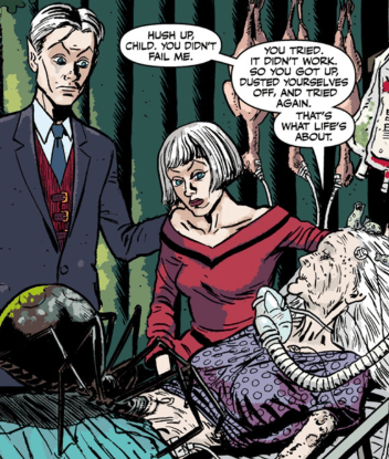 In the bed below them is Susan Finney. She’s ancient now, impossibly old, older than a normal human. She’s linked up to monitors, but not normal ones – there are mystical symbols all around her, demon medicines, and even a spider-demon on her bed. Only the twins know the chemicals being pumped into her.