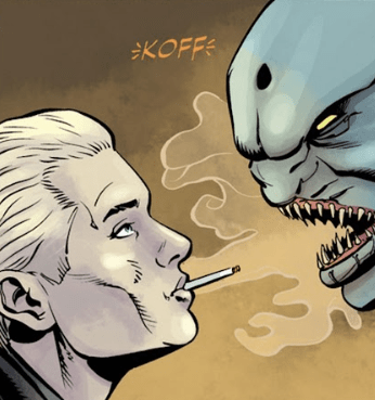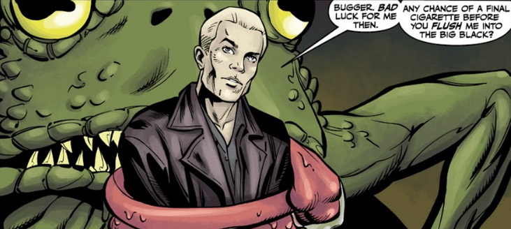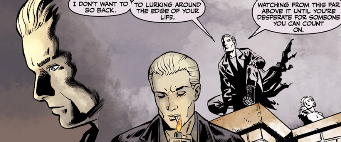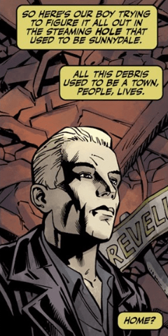 All roads in Sunnydale lead to trouble and heartache. He’s surprised to find however that he feels comfortable at the edge of the crater, the Sunnydale welcome sign still smashed nearby. At least his hands are free now, as he lights another cigarette. He looks down into the dark: he can feel a tingle on the back of his neck – unfinished business.