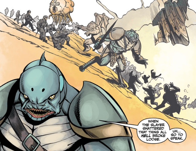 “Oh, I was there, mister,” he says. He sounds almost upset. “When the Slayer shattered that thing, all Hell broke loose. We thought we saw a chance for escape and we took it,” he tells Spike, with regret in his voice. His people were on the battlefield and latched onto a passing demon, heading away from the surface.