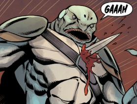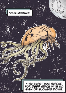 The shark demon sneers, showing it’s charmless smile with pointy teeth. “Glad you’re awake, sunshine,” he snarls at Spike, who’s still wrapped up by tongue. “What’s the fun of tossing your sorry ass out of the airlock if you’re just going to sleep through it?”