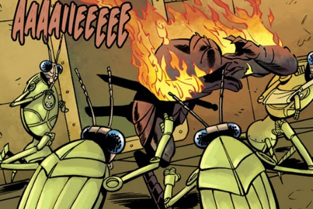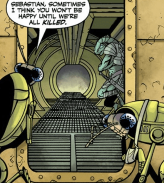 Onboard the interdimensional craft, Sebastian and another cockroach, this one called Frisky, are spying on the one remaining guard left aboard on watch. Frisky is not sure they should move or do anything: he believes Seb simply won’t be happy until they’re all dead! Seb tells Frisky that if he has nothing to live for, then he isn’t alive. “Spike is our master and we must help him.”