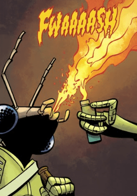 As the guard charges in their direction, Seb spits out and, using a lighter, Frisky sets the spray ablaze, creating an impromptu flame thrower that flambés the guard!