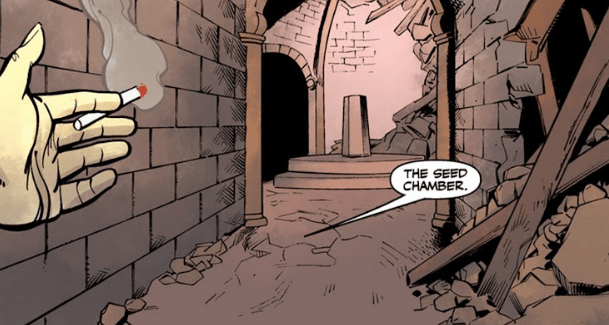 He directs them further, deeper into the crater. The shark thinks Spike is trying to trick them and prepares to attack the vampire until Spike points with his arm. “Relax gentlemen,” he smiles. “Behold the Seed Chamber.”
