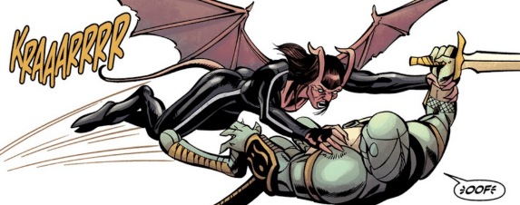 The three look between each other’s gazes, trying to size each other up. The shark demon loses his temper and Spike unfurls his fangs. As the shark demon leaps towards Spike and the woman, he screams that he’ll kill them both. As he approaches the woman however, her eyes glow golden and suddenly she transforms into a harpy of some kind, winged and tailed and sweeping the shark demon into her claws.