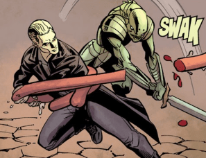 Before he can strike his killing blow, a sword goes squelching through his chest and he looks down as the blade exits his front. Spike is behind him and whispers in his ear: “You’re right about what you said earlier, mate. I would have regretted passing up this little pleasure.” He grins and then uses the sword to decapitate his captor.