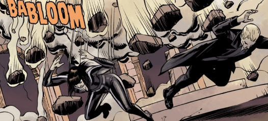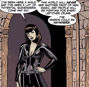 From out of the shadows, a tall, dark haired woman emerges, wearing a black cat suit. “The shards were gone when I arrived. So it looks like we’ve all made the trip for nothing.”