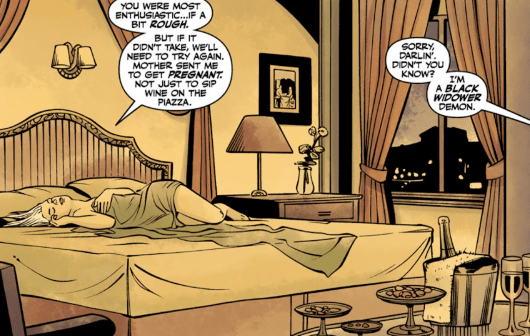 The voice belongs to her partner – a demon, local to Rome but monstrous in form. His six eyes glisten in the low light, mandibles clicking with hunger as he creeps across the bed, his spider-like limbs curling toward her with quiet menace. “Sorry darlin. Didn’t you know? I’m a Black Widower demon.”