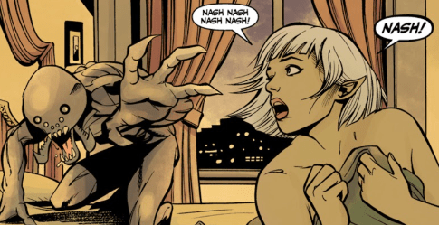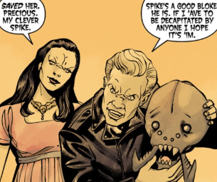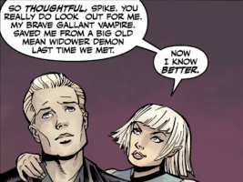 Throughout history, she explains, they were comforters and friends. Advisors to great men and kings. And yes, she admits, the other things Spike imagines they do… As she finishes she tells Spike that she hopes that puts her in a better light. Spike apologises again, this time for his assumption. He’s also noticed she left out all the details about transforming into a creature. She asks his story and he sighs, telling her it’s the same boring tale: boy becomes vampire, rides around in space with giant bugs. His current usual.