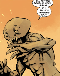 Spike lands hard, crouched low, sneering. The demon, startled but far from cowed, breaks into a nervous grin. His jagged mandibles twitch as he raises both hands in welcome. “Spike! Hey man, I was just coming to see you after I had a light snack. I’ll get you your money I swear!”