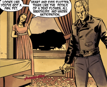 From the jagged remains of the window, a silhouette floats in – Drusilla, wrapped in elegance and madness. Her Italian gown drapes like dying roses. Her face is vamped, regal and cruel, her eyes flickering with riddles. “Looks like you’ve got a fan, pet,” she says, nodding toward Pearl. “Hearts and eyes flutter, tears like the petals of a dead flower. All breathless and maiden anticipation.” Spike turns, face twisted in confusion.