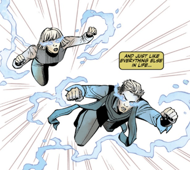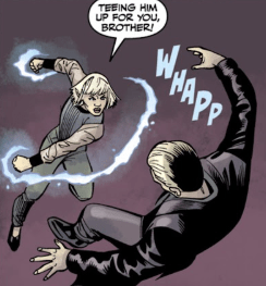 But Spike’s already pivoting – instinct kicking in. As the twins lunge together, their energy streaks like angry comets, he dodges just in time. They crash into the wall with seismic force.