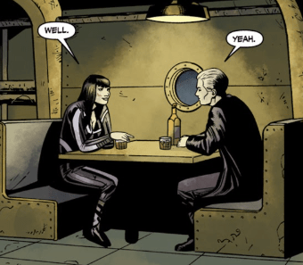 In the communal area on the craft, Spike is pouring a drink. Morgan tells him that she always thought serious talk went better with a stiff drink. Spike pours the whiskey into a glass and leans back. For a moment there’s awkward silence, neither knowing where to start.