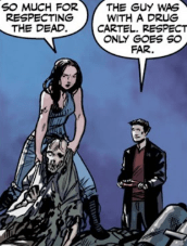 Faith picks up one of the many old, withered corpses lying around. Some are older than Angel, nothing left but bone and dust, but some are more recent: people wandering too close to the creatures presumably. “So much for respecting the dead,” Faith sighs as she drags one of the bodies to Angel’s side. Angel doesn’t agree: “The guy was with a drug cartel. Respect only goes so far.”