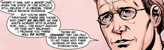 “Jeez, if I knew you were gonna get all Dr. Drew, I’d never let you jump my train. Mentoring problem Slayers was my idea, remember?” Faith looks away, but Giles continues to smile.