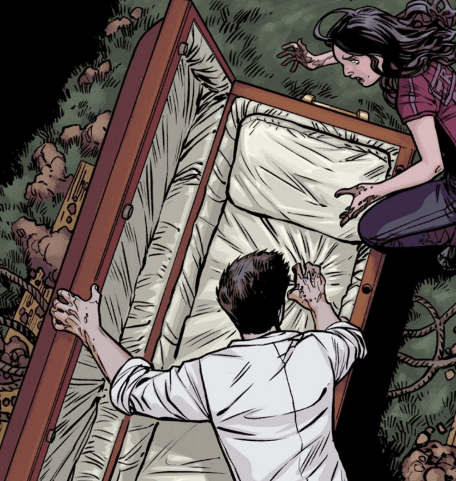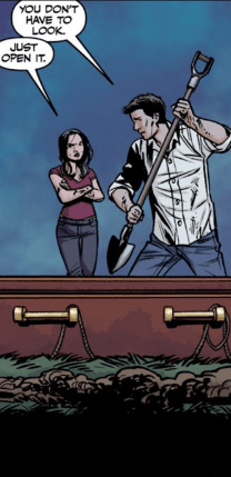 Angel’s shovel suddenly strikes something in the ground. He looks at Faith, nerves etched on both their faces. As he reaches down, he hauls the object up from the hole they’ve dug and brings up the coffin of Rupert Giles. As Angel places it level, he turns to Faith. “You don’t have to look,” he tells her. “Just open it,” Faith tells him, her voice trembling.