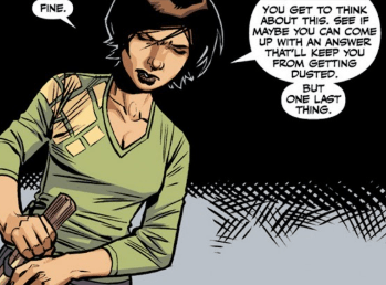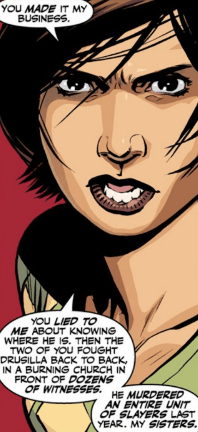 Faith slowly walks closer to Nadira. “Not as a Slayer. Poor kid never had a killer instinct. The moves were okay, technically, but you could tell her heart wasn’t in it.”
