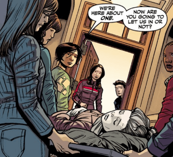 “None of the matters. Not right now. We’re not here about squads of dead Slayers. We’re here about one.” The Slayers part ways and reveal they’re holding a makeshift cot, carrying the corpse of their fallen member Marianne. “Now,” Nadira questions, “Are you going to let us in or not?”