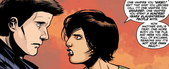 Nadira doesn’t accept his explanation, pointing her finger at him, shaking in rage. “Oh, of course not. You kill demons and monsters and elder Gods like you’re swatting bloody flies, but one vampire keeps getting away from you.” She moves closer, shoving herself straight into Angel’s face. “One vampire you sired, isn’t that what you leeches call it? One vampire you shagged. One vampire you spend a hundred years slaughtering people with.”