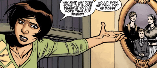 She approaches the picture of young Rupert with Lavinia and Sophie, his time of childhood and innocence. “Why him?” she yells, gesturing at the portrait. “Why does some old bloke deserve to live more than our friend? Would even he think that he does? Or is it not about him at all? Is it just about what you want?”
