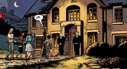In Guildford, later that evening, Nadira and the Slayers walk up a long drive way to the front door of an exquisite mansion. Two tall security guards wait by the door. Nadira walks straight up to them and tells them that she is expected. She asks the guards if they know who she is. The Slayers are still carrying Marianne’s corpse on the stretcher behind them. The guards nod and Nadira smiles, pulling out a long blade. “So you know what’ll happen if you try anything stupid.” The security men don’t even blink. “Right then,” she replies, walking past them confidently. “Take us to your bloody leader.”