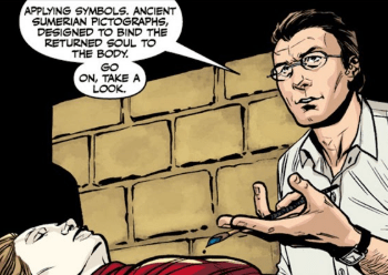 “Applying symbols. Ancient Sumerian pictographs. Designed to bind the returned soul to the body. Go on, take a look.”