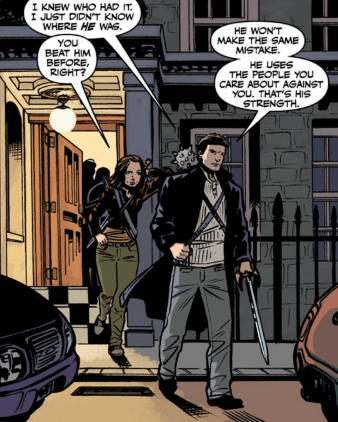 Angel nods, gathering weapons. “He won’t make the same mistake. He uses the people you care about against you. That’s his strength.”