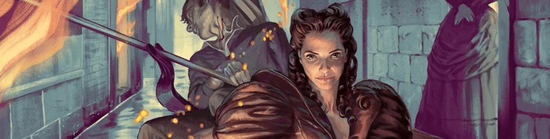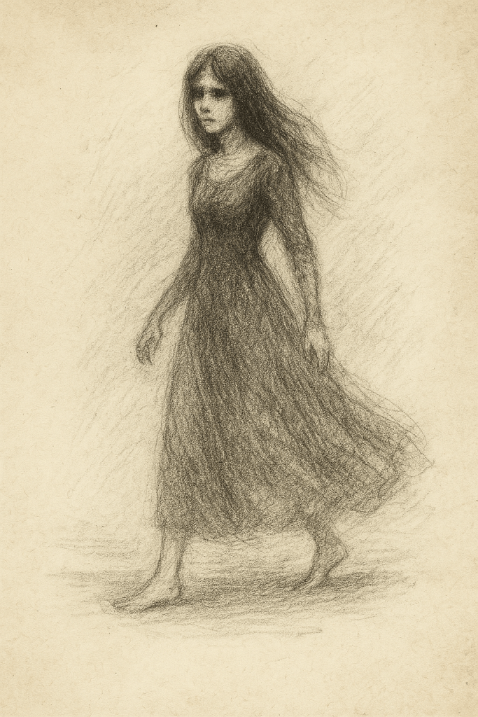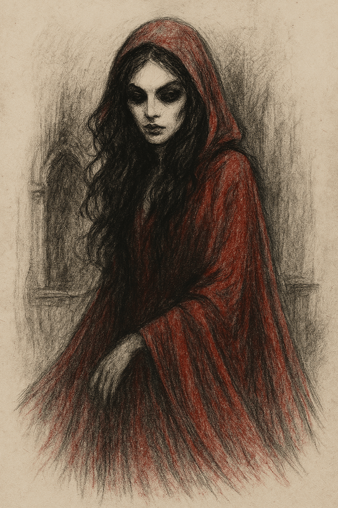 Dress dragging like velvet spilled in ink. Hair dark and wet, straggled like something just wrung from river water. A shape in crimson and bone.