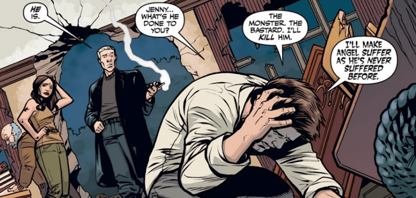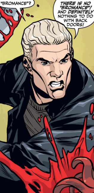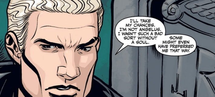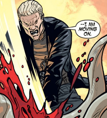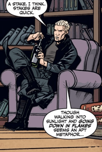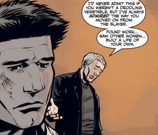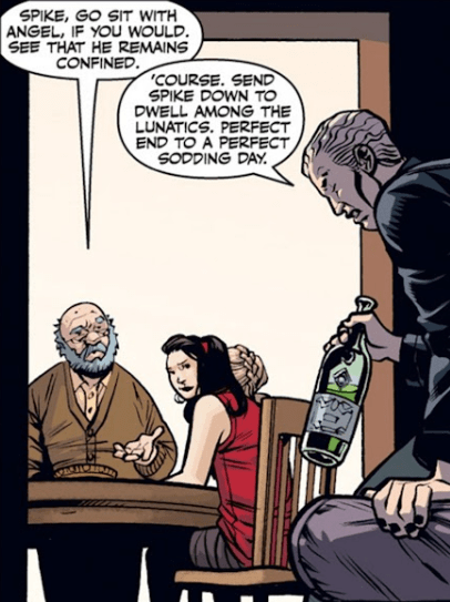 He looks at the still-blank Angel. “I’d never admit this if you weren’t a drooling vegetable, but I’ve always admired the way you moved on from the Slayer. Found work, saw other women… built a life of your own.” He smashes the bottle on the wall, just inches from Angel’s face. The booze goes everywhere. “I’ll tell you this, mate,” Spike says. “I’d give anything to know how you got over her.”