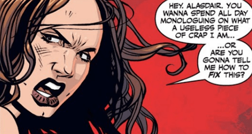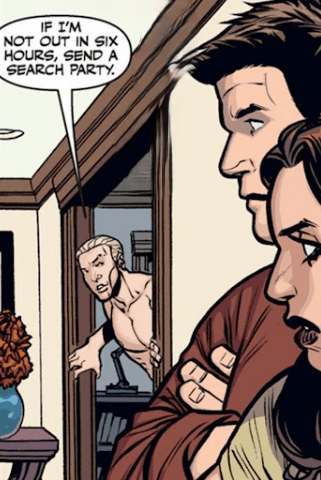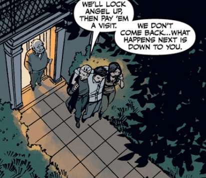 Faith suggests the room at her place, where Angel stayed after first killing Giles. “When he was real bad. Sometimes he’d try to hurt himself.” Alasdair nods quickly, confirming that that will do. They have to get him there immediately.