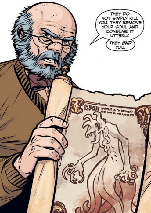 Faith automatically begins to head for the exit. “We go get it.” Alasdair looks after her and tells her it’s not that simple. “It’s in the possession of a coven of Enders.” Spike reacts in alarm to this. Faith asks what Enders are and Alasdair tells her that they are beings that subsist on souls. Or, in practical terms, they eat them. “They do not simply kill you. They remove your soul and consume it utterly. They end you.” Faith immediately understands Spike’s reluctance. Her feelings are even more sure when Alasdair shows her an image of the creatures.