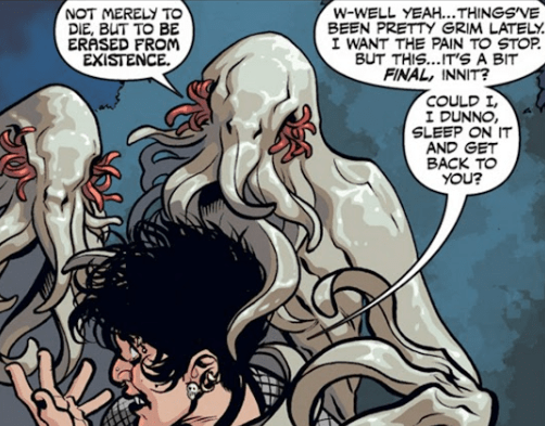 A short time later, in the dead of night. Kensal Green Cemetery, however, is neither quiet nor dead. A young woman is surrounded by Enders. They are tall, slimy looking creatures, who stand on a writhing mass of tentacles that make them look unnatural as they shuffle along the floor. They have sockets where their eyes were, but instead they have more tentacles where their pupils should be. The girl yells at them to leave her alone and one of the creatures peers straight at her. It speaks slowly, their words coming out as if someone is squelching through mud, through a mouth she can’t see.