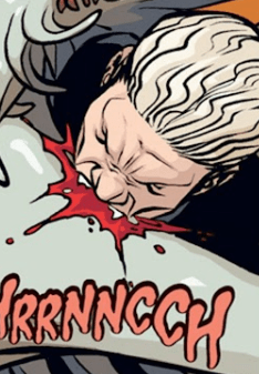 Faith isn’t really paying that much attention to Spike now, as he punctuates his words with his slashing. A pair of Enders suddenly feel brave enough to attack her while her ally is distracted and grab a hold of her, pinning the Slayer to the ground, teeth grinding inches from her face. Spike then brings his axe down on it’s head.