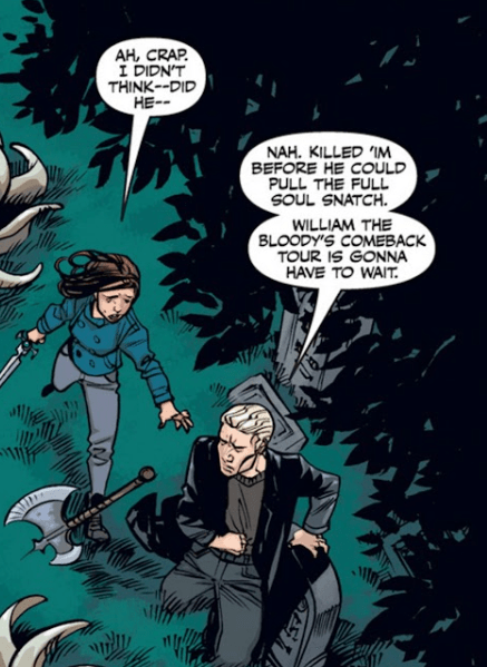 Faith, realising what he means, rushes quickly to his side. “Crap, I didn’t think. Did he…?” she starts to ask, but Spike shakes his head. “Killed him before he could pull the full soul snatch. William the Bloody’s comeback is going to have to wait.” He says he’s okay, but Faith can hear in his voice that he’s rattled. She tells him that she hadn’t really considered the risk to Spike – and offers to complete the mission alone if she has to. Spike scoffs. “Right. Fight a couple of Enders in the Victorian catacombs? You’re good, love, but you’re not up to that.”